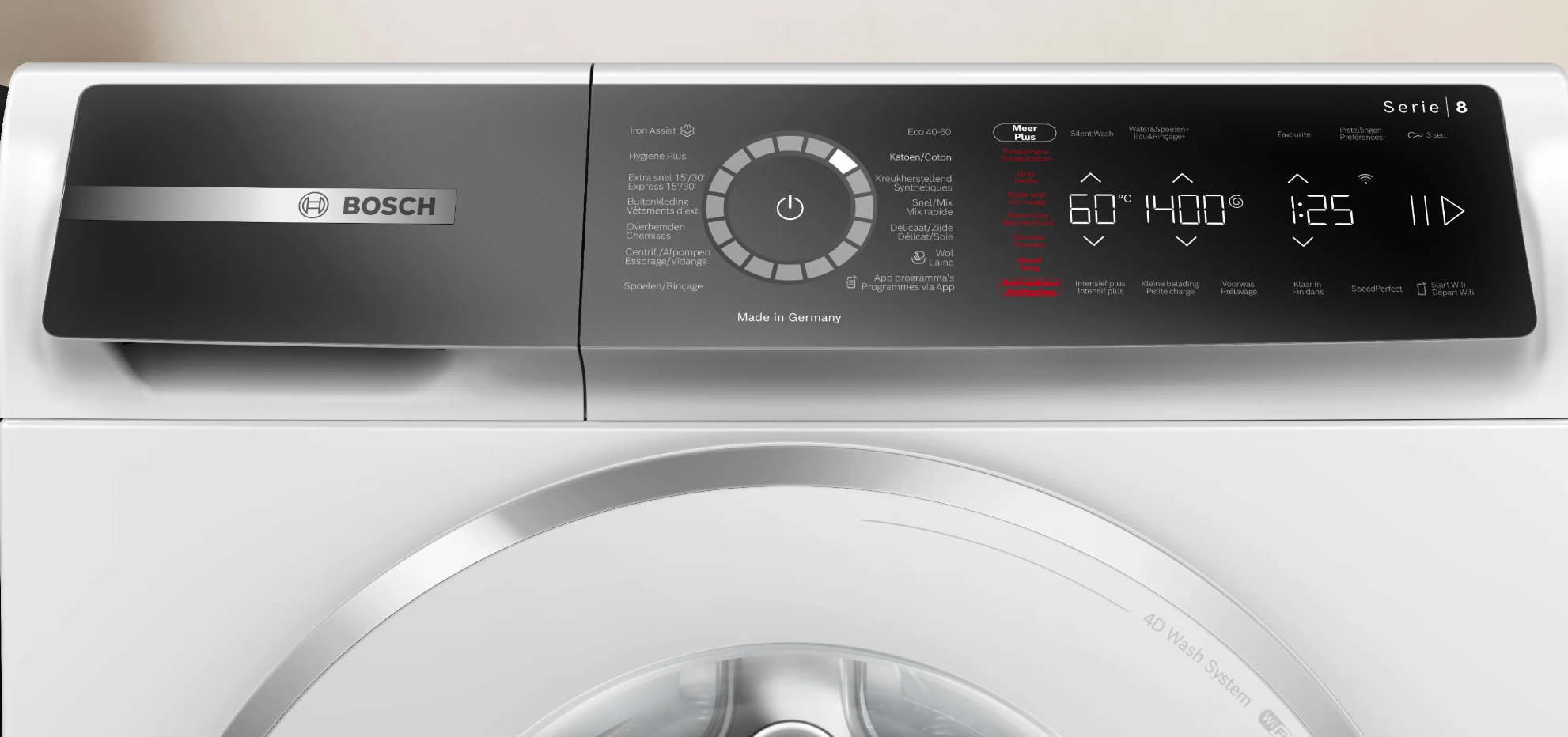Speciale programma's: App, Iron Assist, Hygiene, Afpompen/ Centrifugeren, Mix/Snel, Spoelen, Extra snel 15'/30', Overhemden, Outdoor