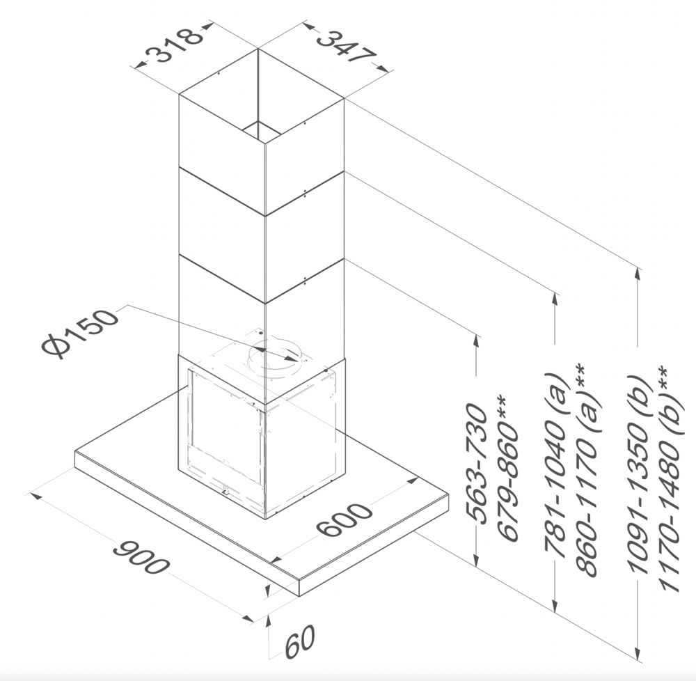 Max hoogte met schachtverlengstuk [b] met recirculatie (mm) 1480
