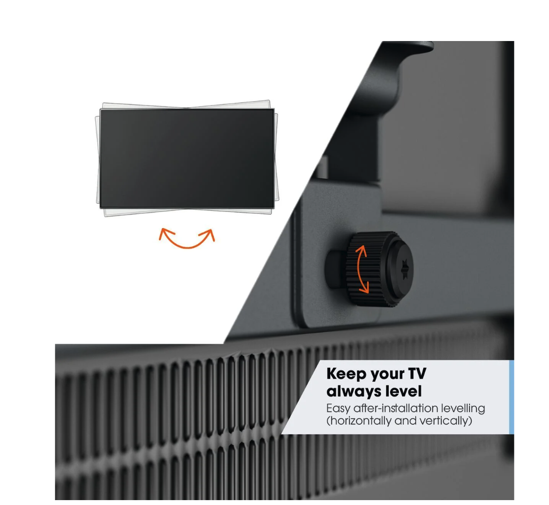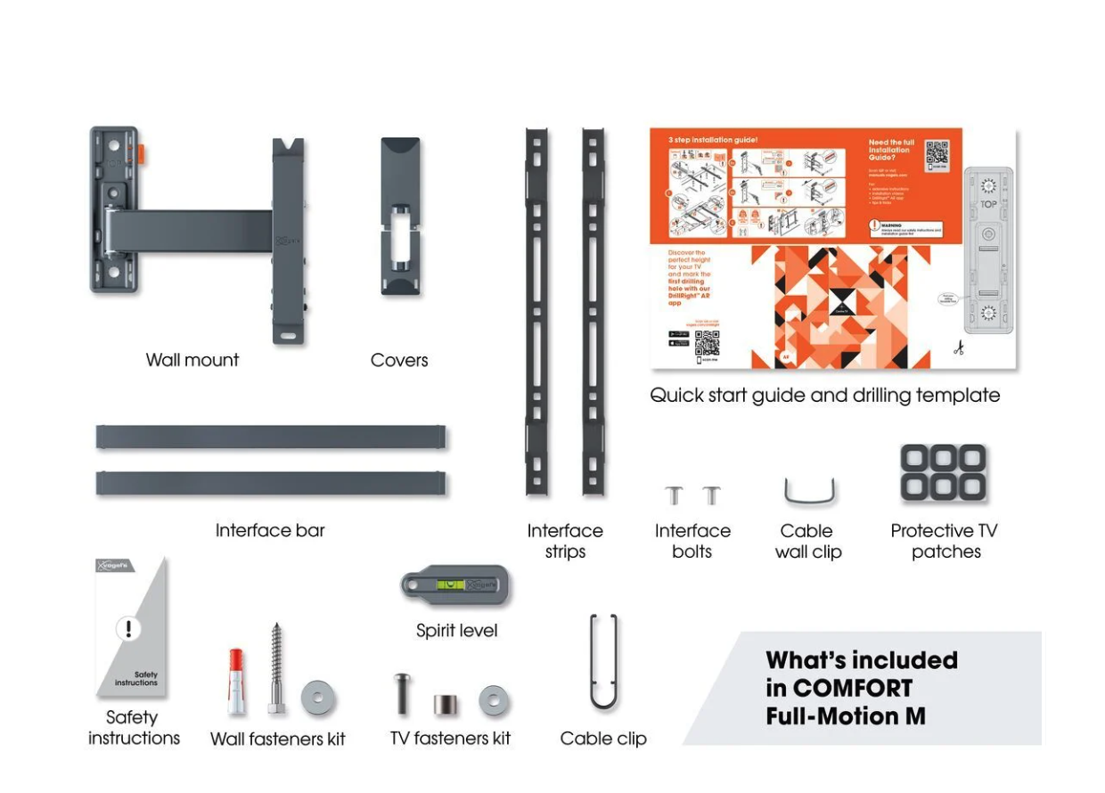 Wat zit er in de doos Muurbeugel, Kabelklem, Muurbevestigingskit met fischer® Duo Power plugs, TV-bevestigingskit, Protective TV patches, Waterpas, Quick Installation Guide, DrillRight app, Boormal